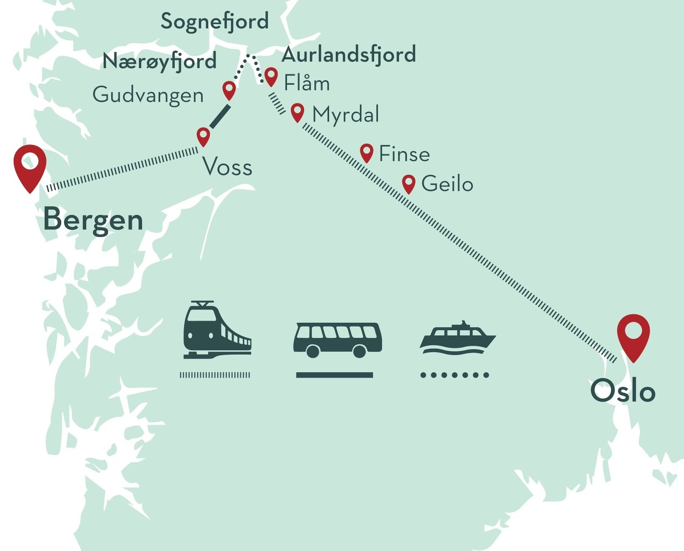 Fra Bergen går turen med tog det første stykke af Bergensbanen, til byen Voss, der er omgivet af høje fjelde. Fra Voss fortsætter rejsen med bus gennem den smukke og dramatiske Nærøydal, hvor stejle fjeldsider og brusende elve danner rammen om en storslået naturoplevelse. Turen ender i Gudvangen, i bunden af Nærøyfjorden.