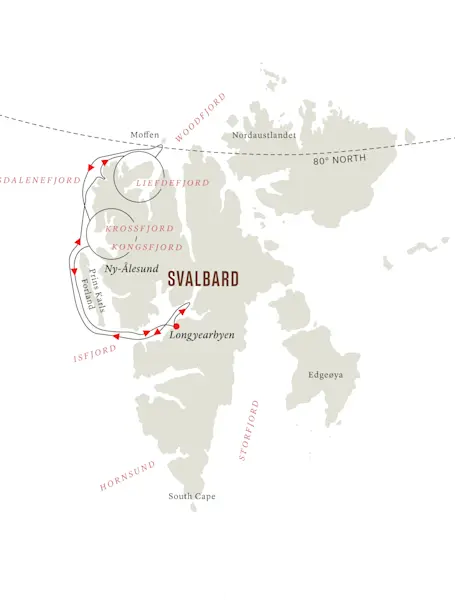 Tag på det ultimative arktiske sommerkrydstogt til Svalbard. Rejsen følger den betagende vestkyst af Spitsbergen helt op til den 80. breddegrad. Oplev det øde og storslåede arktiske landskab med isfyldte fjorde, eksotisk dyreliv og verdens nordligste by, Longyearbyen.