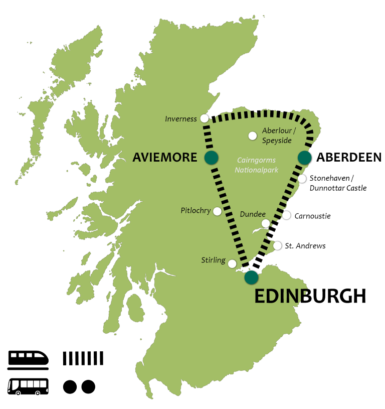 Rejsen kan fleksibelt tilpasses med længere ophold eller yderligere stop, afhængigt af hvilke dele af østlige Skotland man ønsker at udforske.
